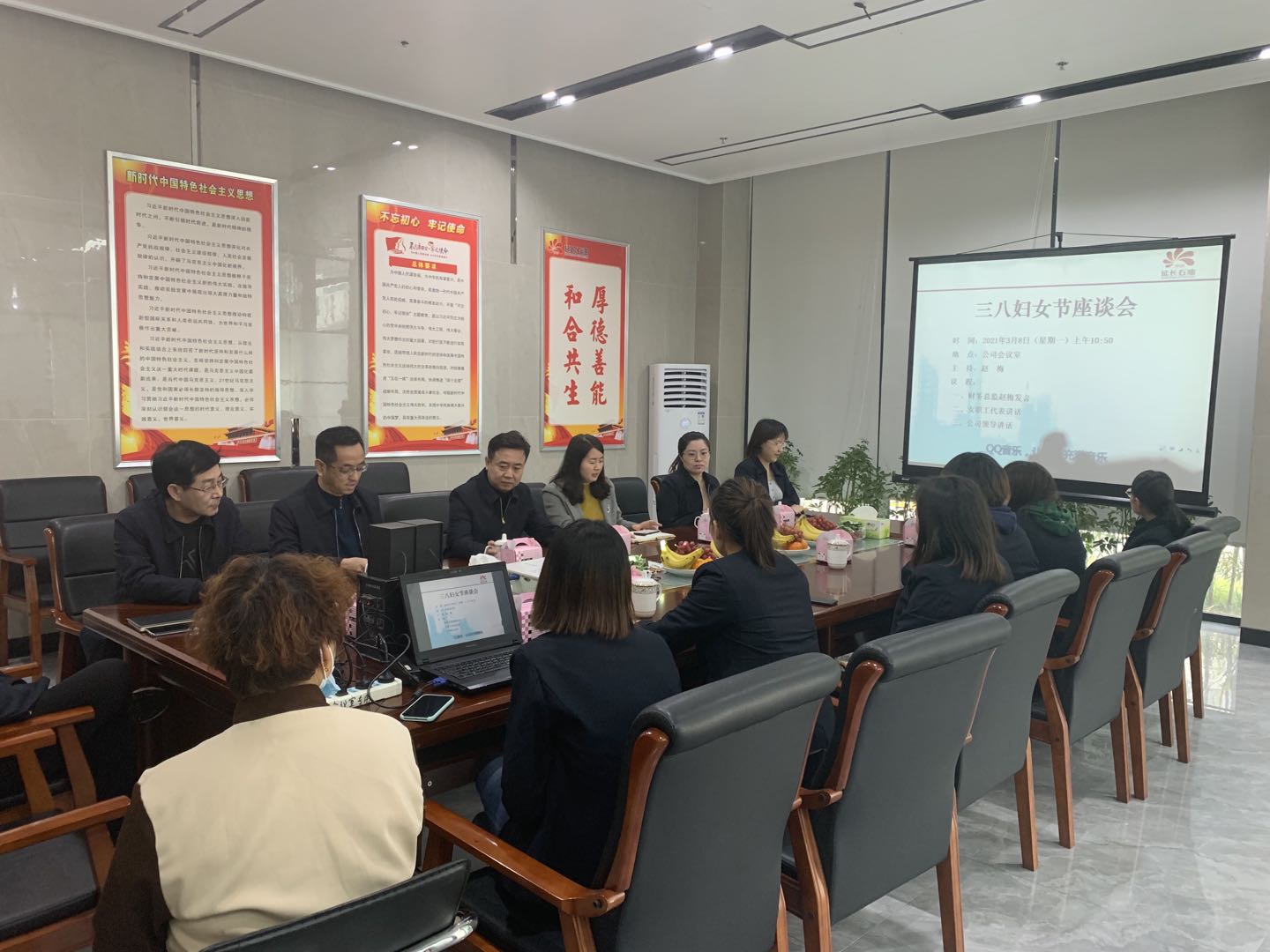 2021年3月8日上午,公司在会议室举办了三·八国际妇女节座谈会,会议由财务总监赵梅主持,公司领导及全体女工参会。